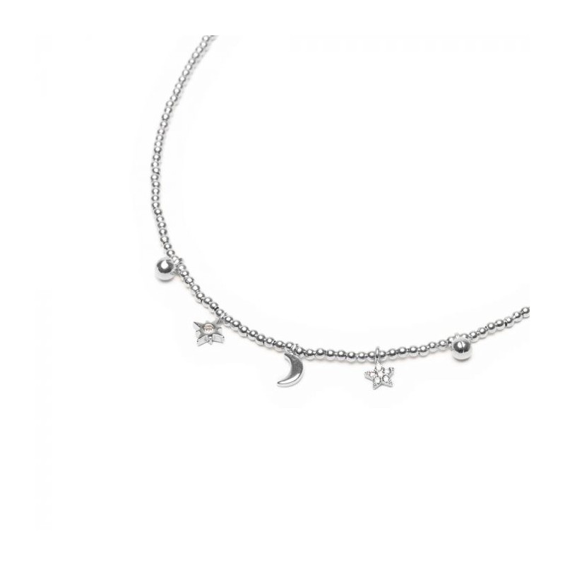 Collana modello girocollo mix ciondoli notte luna/stelle. Pietre in zirconia. Chiusura regolabile con moschettone. Placcatura in argento. Nickel tested. Lavorazione artigianale.